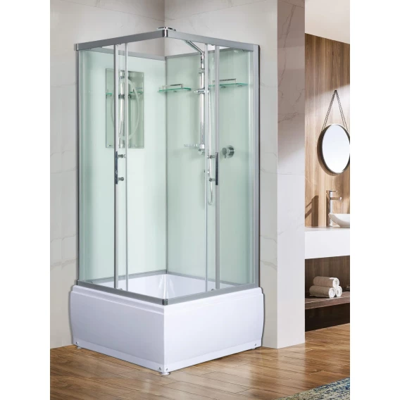 Душевой шланг, Душевая лейка, Держатель для душевой лейки, Подключение для душевого шланга, Полочка, Ручки, Металлический каркас, Поддон, Сиденье, Смеситель, Сифон, Мыльница, Штанга душевая, Ножки, Зеркало