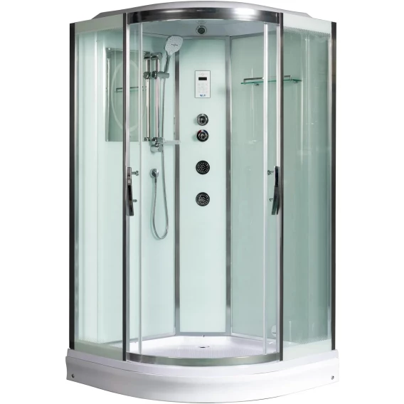 Душевой шланг, Душевая лейка, Держатель для душевой лейки, Подключение для душевого шланга, Полочка, Ручки, Подсветка, Верхний душ, Bluetooth, Динамик, Металлический каркас, Поддон, Радио, Сифон, Мыльница, Штанга душевая, Термостат, Ножки, Зеркало