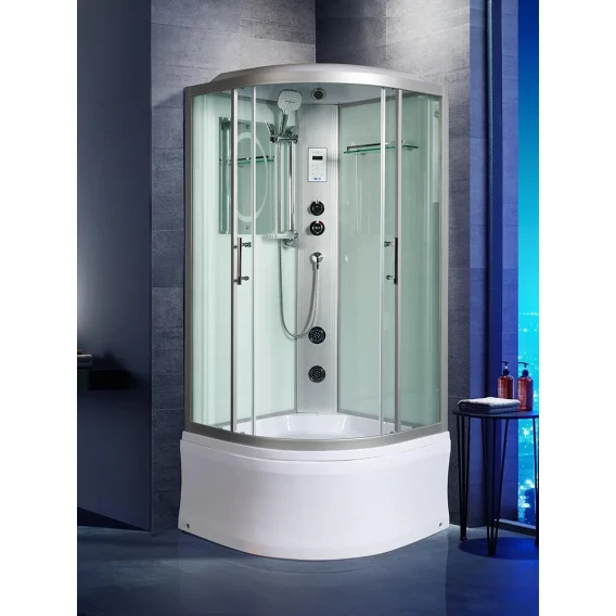 Душевой шланг, Душевая лейка, Держатель для душевой лейки, Подключение для душевого шланга, Полочка, Ручки, Подсветка, Верхний душ, Bluetooth, Динамик, Металлический каркас, Поддон, Сиденье, Радио, Сифон, Мыльница, Штанга душевая, Термостат, Ножки, Зеркало
