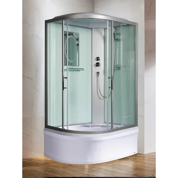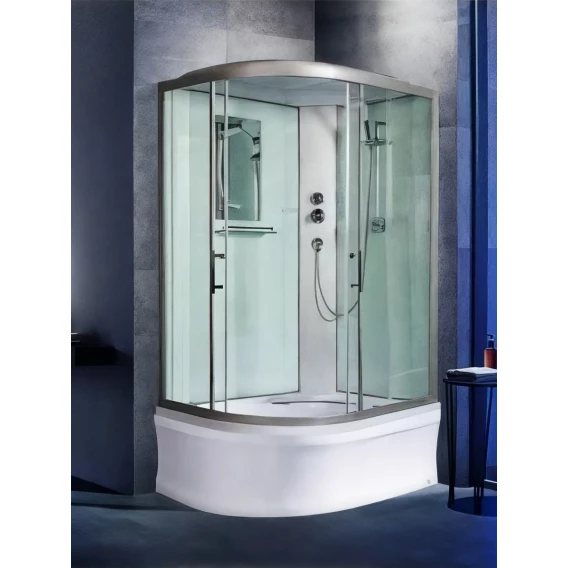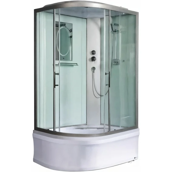 Душевой шланг, Душевая лейка, Держатель для душевой лейки, Подключение для душевого шланга, Полочка, Ручки, Верхний душ, Металлический каркас, Поддон, Сиденье, Смеситель, Сифон, Мыльница, Штанга душевая, Ножки, Зеркало