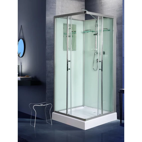 Душевой шланг, Душевая лейка, Держатель для душевой лейки, Подключение для душевого шланга, Полочка, Ручки, Металлический каркас, Поддон, Смеситель, Сифон, Мыльница, Штанга душевая, Ножки, Зеркало