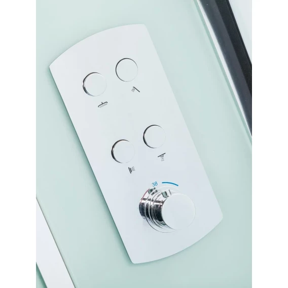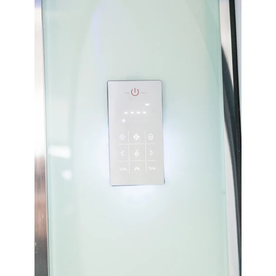 Душевой шланг, Душевая лейка, Держатель для душевой лейки, Подключение для душевого шланга, Полочка, Подсветка, Верхний душ, Bluetooth, Динамик, Металлический каркас, Ручка, Поддон, Радио, Сифон, Штанга душевая, Термостат, Ножки, Зеркало