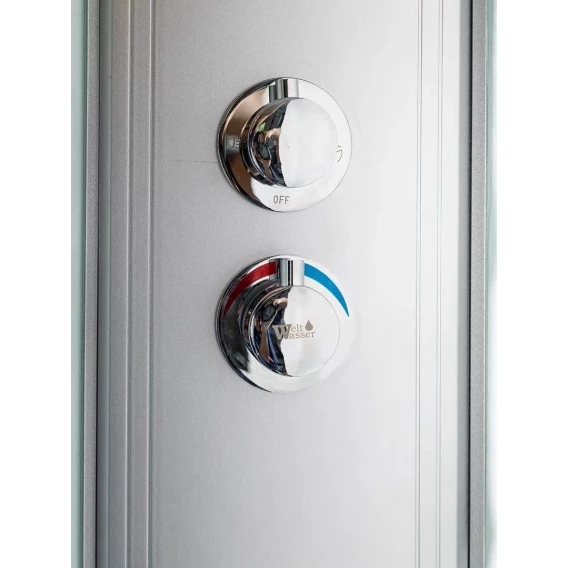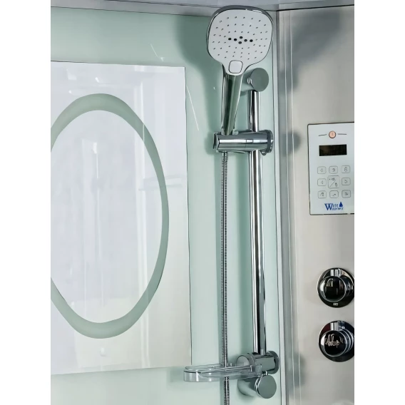 Душевой шланг, Душевая лейка, Держатель для душевой лейки, Подключение для душевого шланга, Полочка, Ручки, Подсветка, Верхний душ, Bluetooth, Динамик, Металлический каркас, Поддон, Радио, Сифон, Мыльница, Штанга душевая, Термостат, Ножки, Зеркало