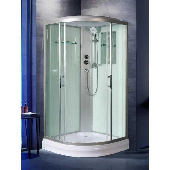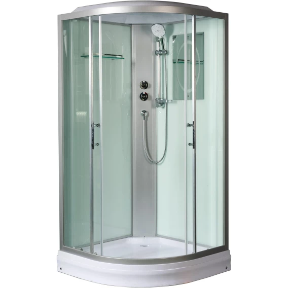 Душевой шланг, Душевая лейка, Держатель для душевой лейки, Подключение для душевого шланга, Полочка, Ручки, Верхний душ, Металлический каркас, Поддон, Смеситель, Сифон, Мыльница, Штанга душевая, Ножки, Зеркало