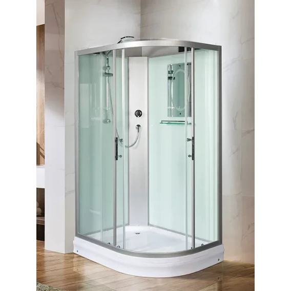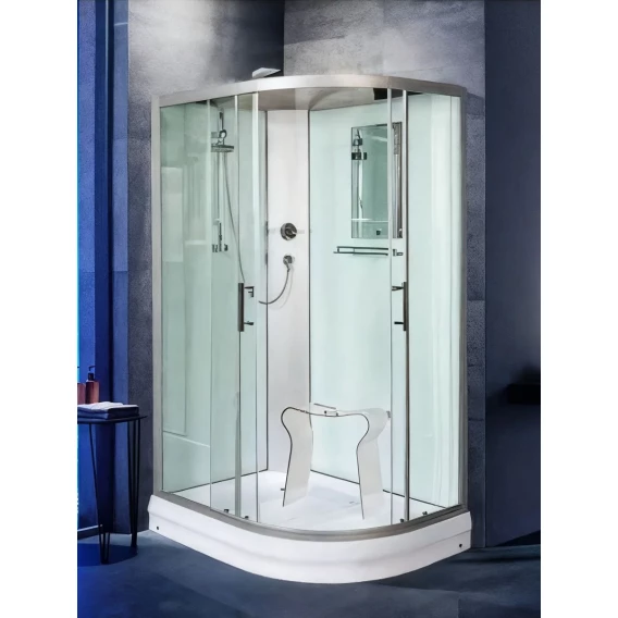 Душевой шланг, Душевая лейка, Держатель для душевой лейки, Подключение для душевого шланга, Полочка, Ручки, Металлический каркас, Поддон, Смеситель, Сифон, Мыльница, Штанга душевая, Ножки, Зеркало