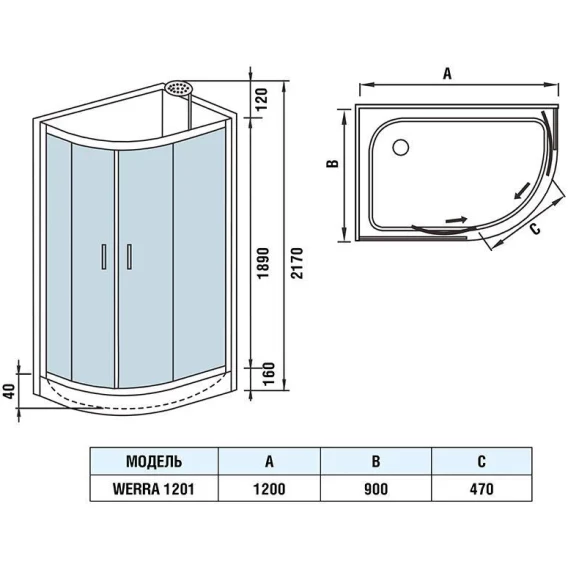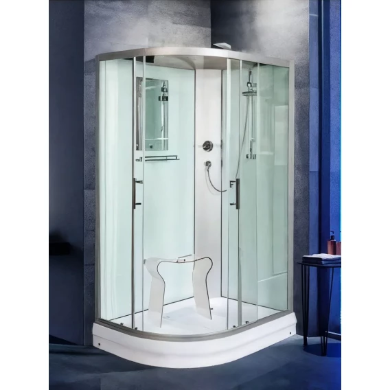 Душевой шланг, Душевая лейка, Держатель для душевой лейки, Подключение для душевого шланга, Полочка, Ручки, Металлический каркас, Поддон, Смеситель, Сифон, Мыльница, Штанга душевая, Ножки, Зеркало