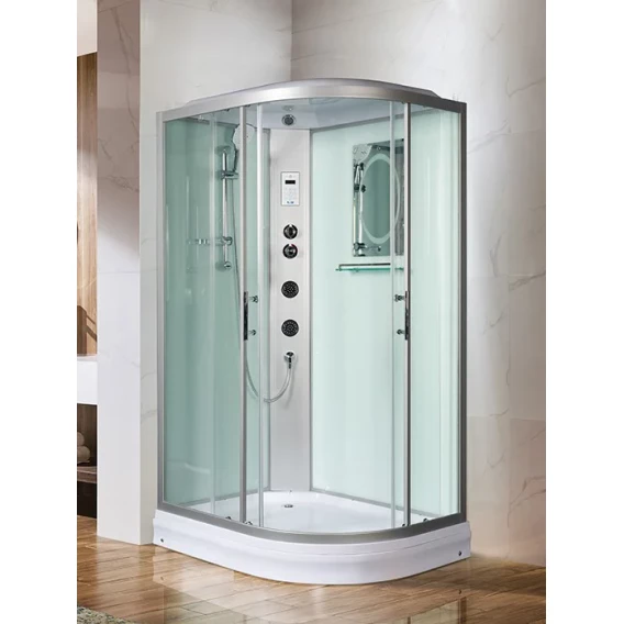 Душевой шланг, Душевая лейка, Держатель для душевой лейки, Подключение для душевого шланга, Полочка, Ручки, Подсветка, Верхний душ, Bluetooth, Динамик, Металлический каркас, Поддон, Радио, Сифон, Мыльница, Штанга душевая, Термостат, Ножки, Зеркало