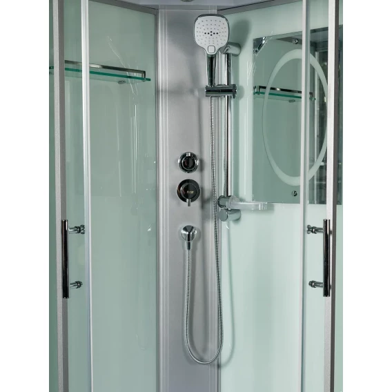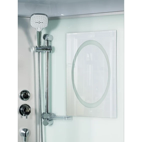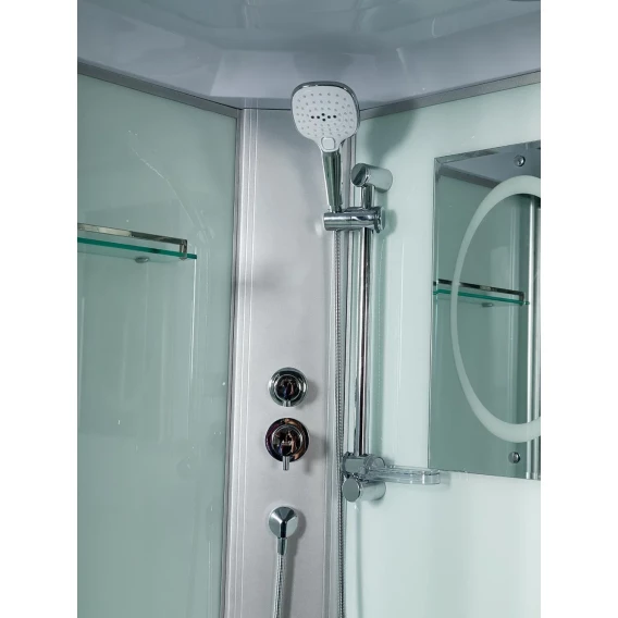 Душевой шланг, Душевая лейка, Держатель для душевой лейки, Подключение для душевого шланга, Полочка, Ручки, Верхний душ, Металлический каркас, Поддон, Смеситель, Сифон, Мыльница, Штанга душевая, Ножки, Зеркало