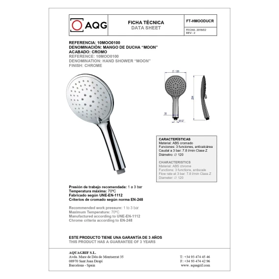 Душевая лейка AQG Moon 10MOO0100 120 мм, 3 режима, хром