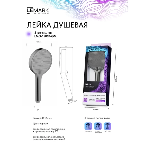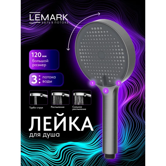 Душевая лейка Lemark LMD-1501P-GM 120 мм, 3 режима, графит матовый