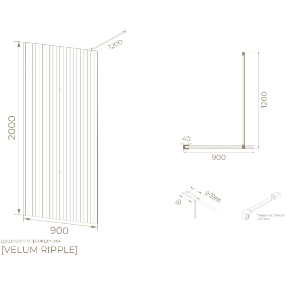 Душевая перегородка Knotlor Velum WI090CG1GM 90 см, профиль вороненая сталь, стекло рифленое