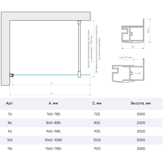 Душевая перегородка Vegas Glass EAF NOVO h2000 86 07 crystalvision 86 см, профиль матовый хром, стекло прозрачное
