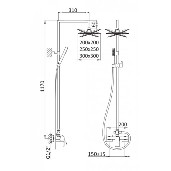 Металлическая розетка, Эксцентрики, Душевой шланг, Душевая лейка, Держатель для душевой лейки, Верхний душ, Смеситель, Кронштейн, Штанга душевая