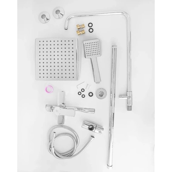 Аэратор, Металлическая розетка, Эксцентрики, Душевой шланг, Душевая лейка, Держатель для душевой лейки, Верхний душ, Смеситель, Кронштейн, Штанга душевая