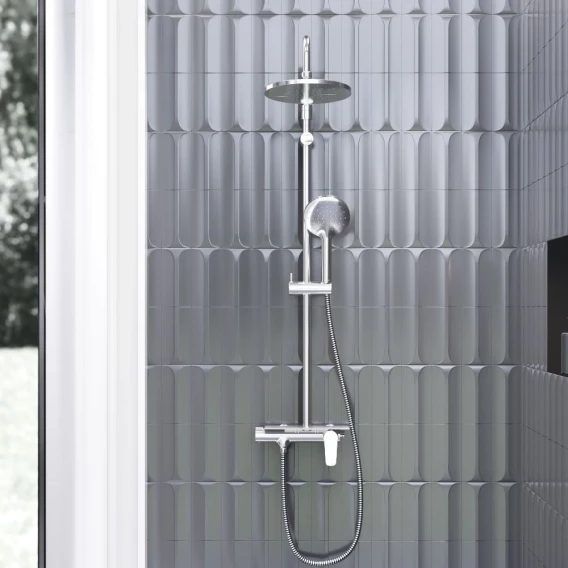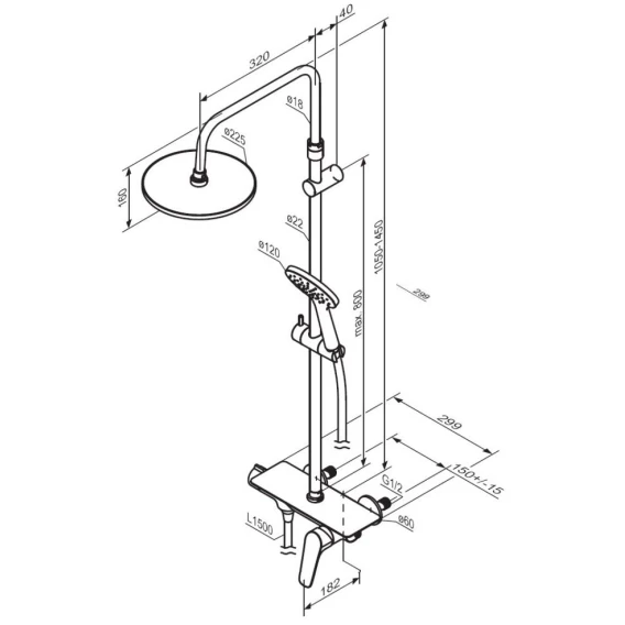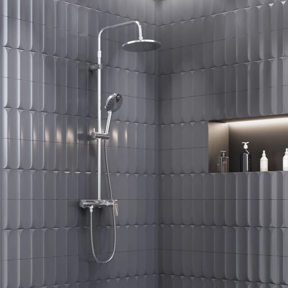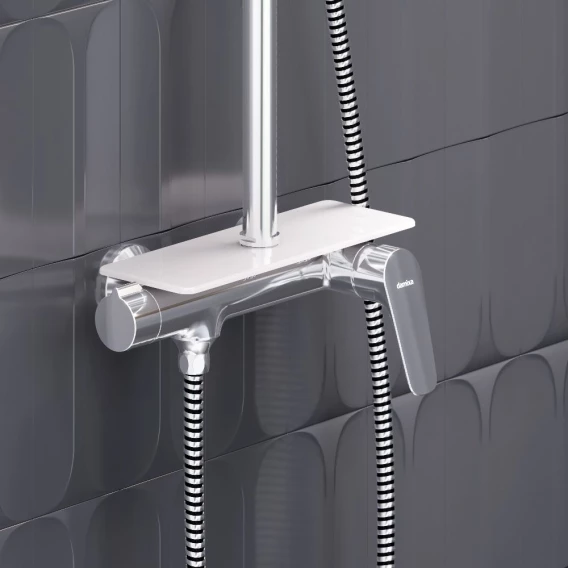 Металлическая розетка, Эксцентрики, Душевой шланг, Душевая лейка, Держатель для душевой лейки, Полочка, Верхний душ, Смеситель, Кронштейн, Штанга душевая