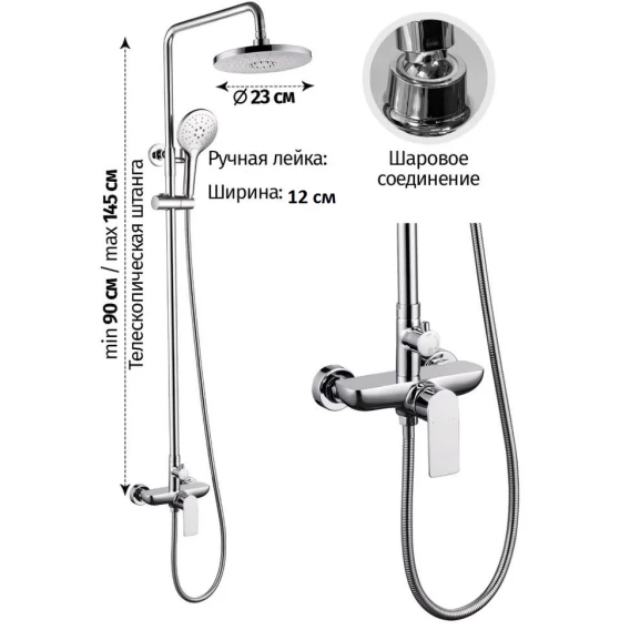 Металлическая розетка, Эксцентрики, Душевой шланг, Душевая лейка, Держатель для душевой лейки, Верхний душ, Смеситель, Кронштейн, Штанга душевая