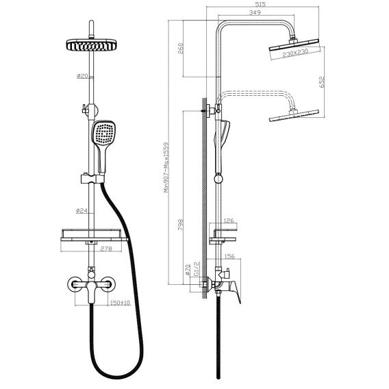 Металлическая розетка, Эксцентрики, Душевой шланг, Душевая лейка, Держатель для душевой лейки, Полочка, Верхний душ, Смеситель, Кронштейн, Штанга душевая