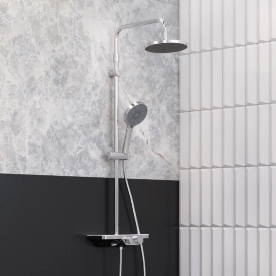 Душевой шланг, Душевая лейка, Держатель для душевой лейки, Полочка, Верхний душ, Смеситель, Кронштейн, Штанга душевая