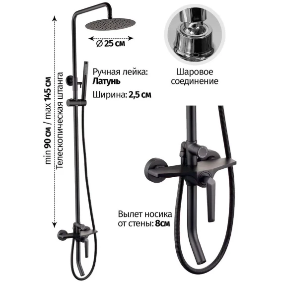 Аэратор, Металлическая розетка, Эксцентрики, Душевой шланг, Душевая лейка, Держатель для душевой лейки, Верхний душ, Смеситель, Кронштейн, Штанга душевая