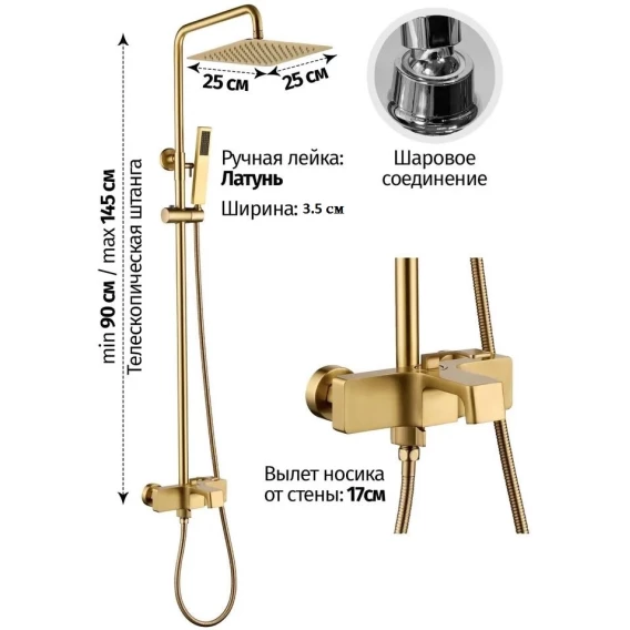 Аэратор, Металлическая розетка, Эксцентрики, Душевой шланг, Душевая лейка, Держатель для душевой лейки, Верхний душ, Смеситель, Кронштейн, Штанга душевая