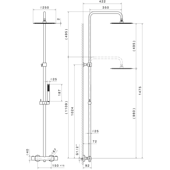 Металлическая розетка, Эксцентрики, Душевой шланг, Душевая лейка, Держатель для душевой лейки, Верхний душ, Кронштейн, Штанга душевая, Термостат