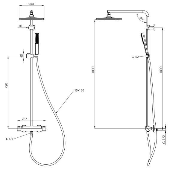 Металлическая розетка, Эксцентрики, Душевой шланг, Душевая лейка, Держатель для душевой лейки, Верхний душ, Кронштейн, Штанга душевая, Термостат