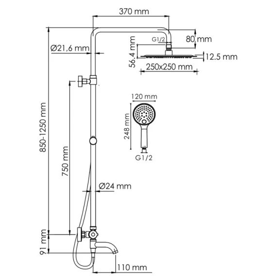 Душевая система 250 мм WasserKRAFT Sauer A188.256.207.PG T