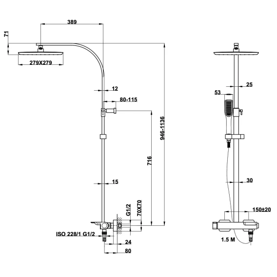 Аэратор, Металлическая розетка, Эксцентрики, Душевой шланг, Душевая лейка, Держатель для душевой лейки, Верхний душ, Смеситель, Кронштейн, Штанга душевая