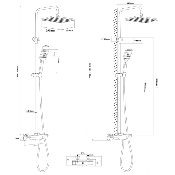 Аэратор, Металлическая розетка, Эксцентрики, Душевой шланг, Душевая лейка, Держатель для душевой лейки, Верхний душ, Кронштейн, Штанга душевая, Термостат