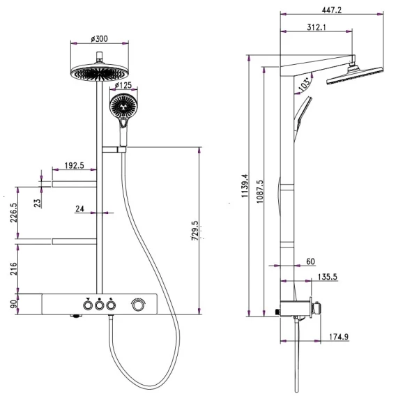 Аэратор, Душевой шланг, Душевая лейка, Держатель для душевой лейки, Полочка, Верхний душ, Смеситель, Кронштейн