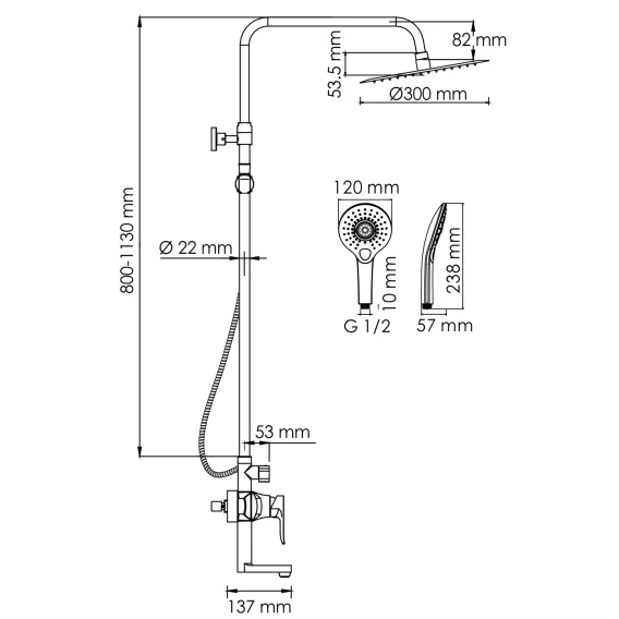 • Стойка для душа, Ø 22 мм регулируемая по высоте