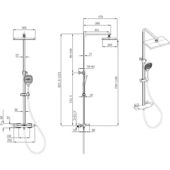 Аэратор, Металлическая розетка, Эксцентрики, Душевой шланг, Душевая лейка, Держатель для душевой лейки, Полочка, Верхний душ, Смеситель, Кронштейн, Штанга душевая