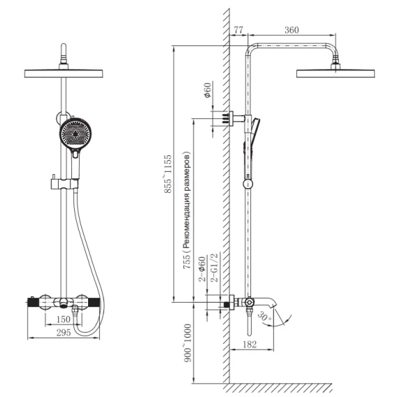 Аэратор, Металлическая розетка, Эксцентрики, Душевой шланг, Душевая лейка, Держатель для душевой лейки, Верхний душ, Кронштейн, Штанга душевая, Термостат