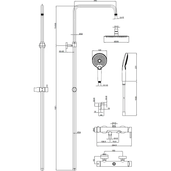 Аэратор, Металлическая розетка, Эксцентрики, Душевой шланг, Душевая лейка, Держатель для душевой лейки, Верхний душ, Смеситель, Кронштейн, Штанга душевая