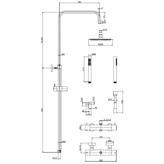 Металлическая розетка, Эксцентрики, Душевой шланг, Душевая лейка, Держатель для душевой лейки, Кронштейн, Штанга душевая, Термостат
