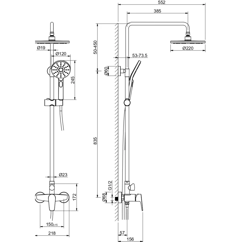 Металлическая розетка, Эксцентрики, Душевой шланг, Душевая лейка, Держатель для душевой лейки, Верхний душ, Смеситель, Кронштейн, Штанга душевая