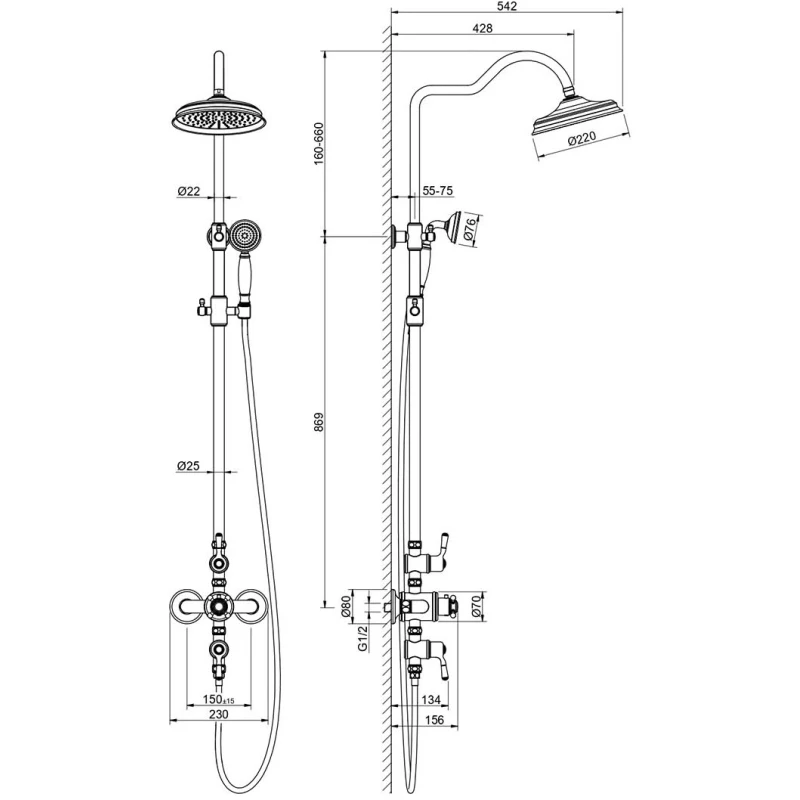 Металлическая розетка, Эксцентрики, Душевой шланг, Душевая лейка, Держатель для душевой лейки, Верхний душ, Кронштейн, Штанга душевая, Термостат