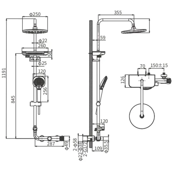 Металлическая розетка, Эксцентрики, Душевой шланг, Душевая лейка, Держатель для душевой лейки, Полочка, Верхний душ, Кронштейн, Штанга душевая, Термостат