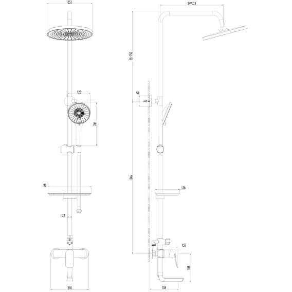 Аэратор, Металлическая розетка, Эксцентрики, Душевой шланг, Душевая лейка, Держатель для душевой лейки, Полочка, Верхний душ, Смеситель, Кронштейн, Штанга душевая