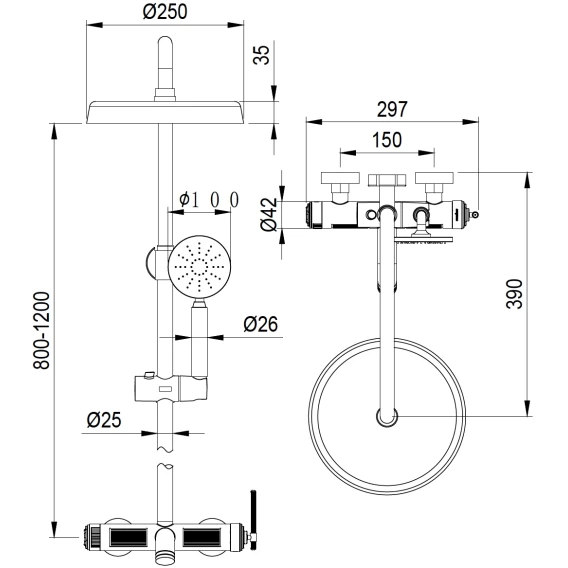Аэратор, Металлическая розетка, Эксцентрики, Душевой шланг, Душевая лейка, Держатель для душевой лейки, Верхний душ, Смеситель, Кронштейн, Штанга душевая