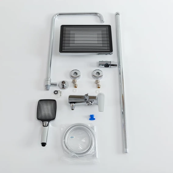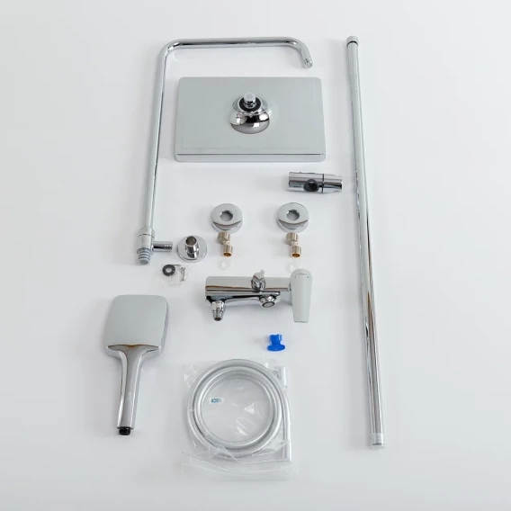 Аэратор, Металлическая розетка, Эксцентрики, Душевой шланг, Душевая лейка, Держатель для душевой лейки, Верхний душ, Смеситель, Кронштейн, Штанга душевая