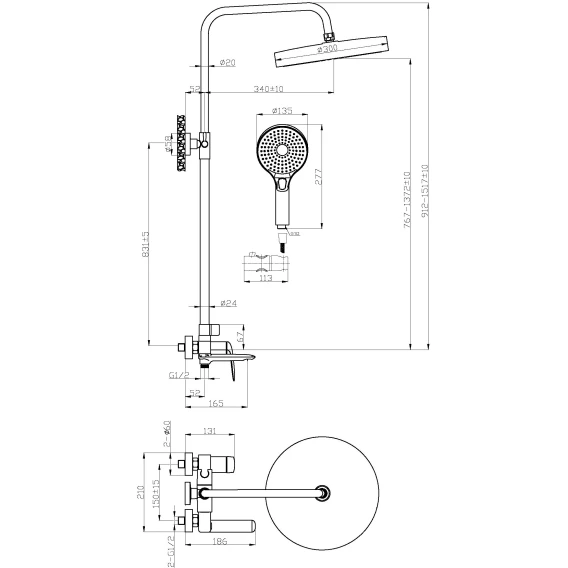 Аэратор, Металлическая розетка, Эксцентрики, Душевой шланг, Душевая лейка, Держатель для душевой лейки, Верхний душ, Смеситель, Кронштейн, Штанга душевая