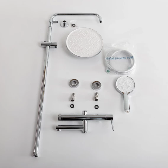 Аэратор, Металлическая розетка, Эксцентрики, Душевой шланг, Душевая лейка, Держатель для душевой лейки, Верхний душ, Смеситель, Кронштейн, Штанга душевая