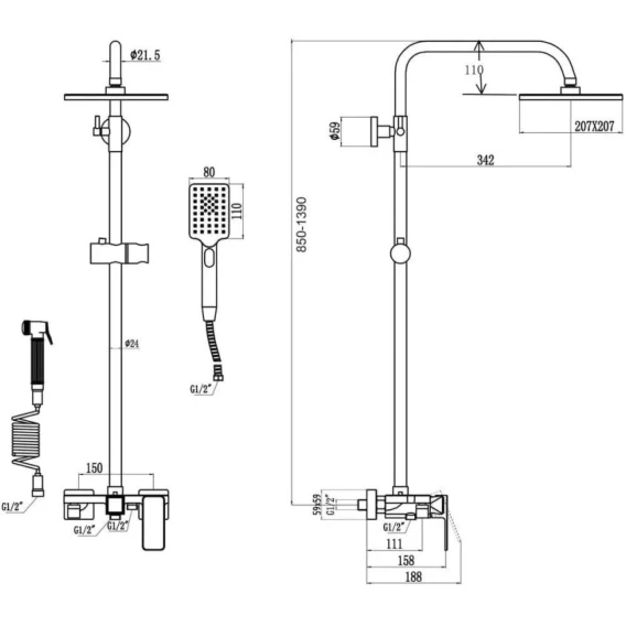 Аэратор, Металлическая розетка, Эксцентрики, Душевой шланг, Душевая лейка, Держатель для душевой лейки, Полочка, Верхний душ, Смеситель, Кронштейн, Штанга душевая