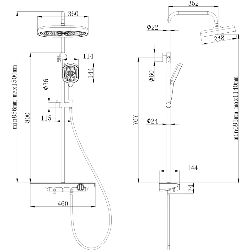 Аэратор, Эксцентрики, Душевой шланг, Душевая лейка, Держатель для душевой лейки, Полочка, Верхний душ, Смеситель, Кронштейн, Штанга душевая