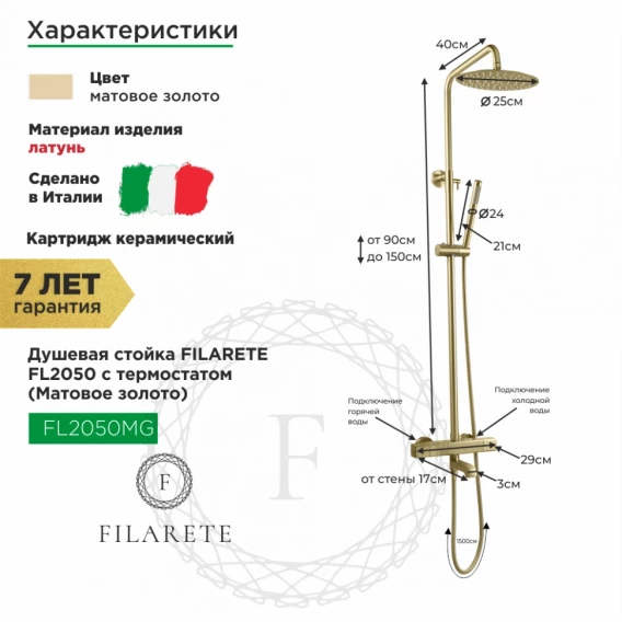 Душевая система Filarete FL2050MG 250 мм, с термостатом, золотой матовый