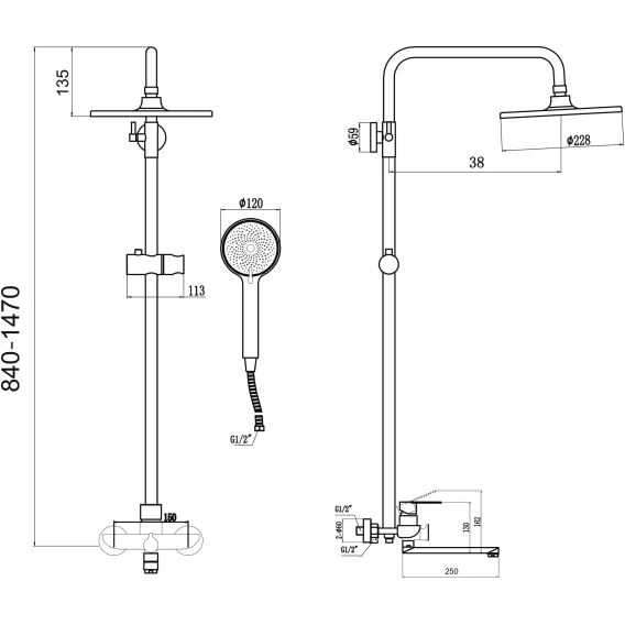 - Телескопическая душевая штанга позволяет регулировать высоту верхнего душа под рост любого члена семьи. Держатель ручной лейки фиксируется в двух положениях