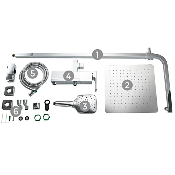 Аэратор, Металлическая розетка, Эксцентрики, Душевой шланг, Душевая лейка, Держатель для душевой лейки, Верхний душ, Смеситель, Кронштейн, Штанга душевая