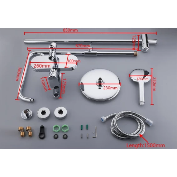 Аэратор, Металлическая розетка, Эксцентрики, Душевой шланг, Душевая лейка, Держатель для душевой лейки, Верхний душ, Смеситель, Кронштейн, Штанга душевая