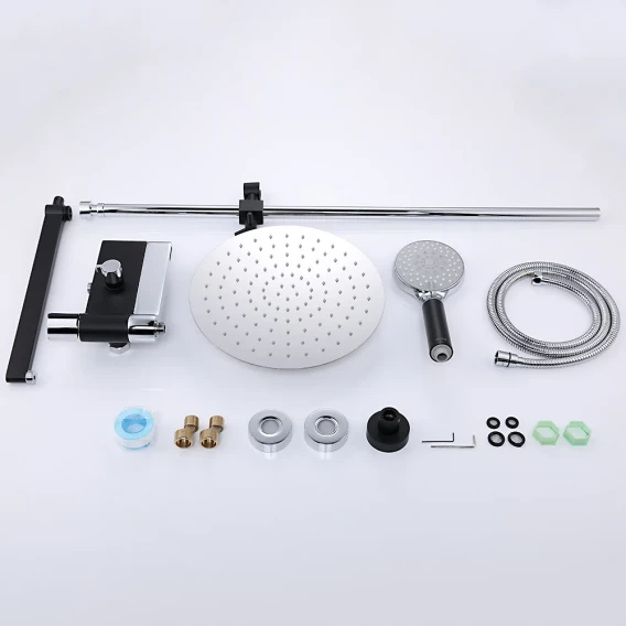Аэратор, Металлическая розетка, Эксцентрики, Душевой шланг, Душевая лейка, Держатель для душевой лейки, Верхний душ, Смеситель, Кронштейн, Штанга душевая
